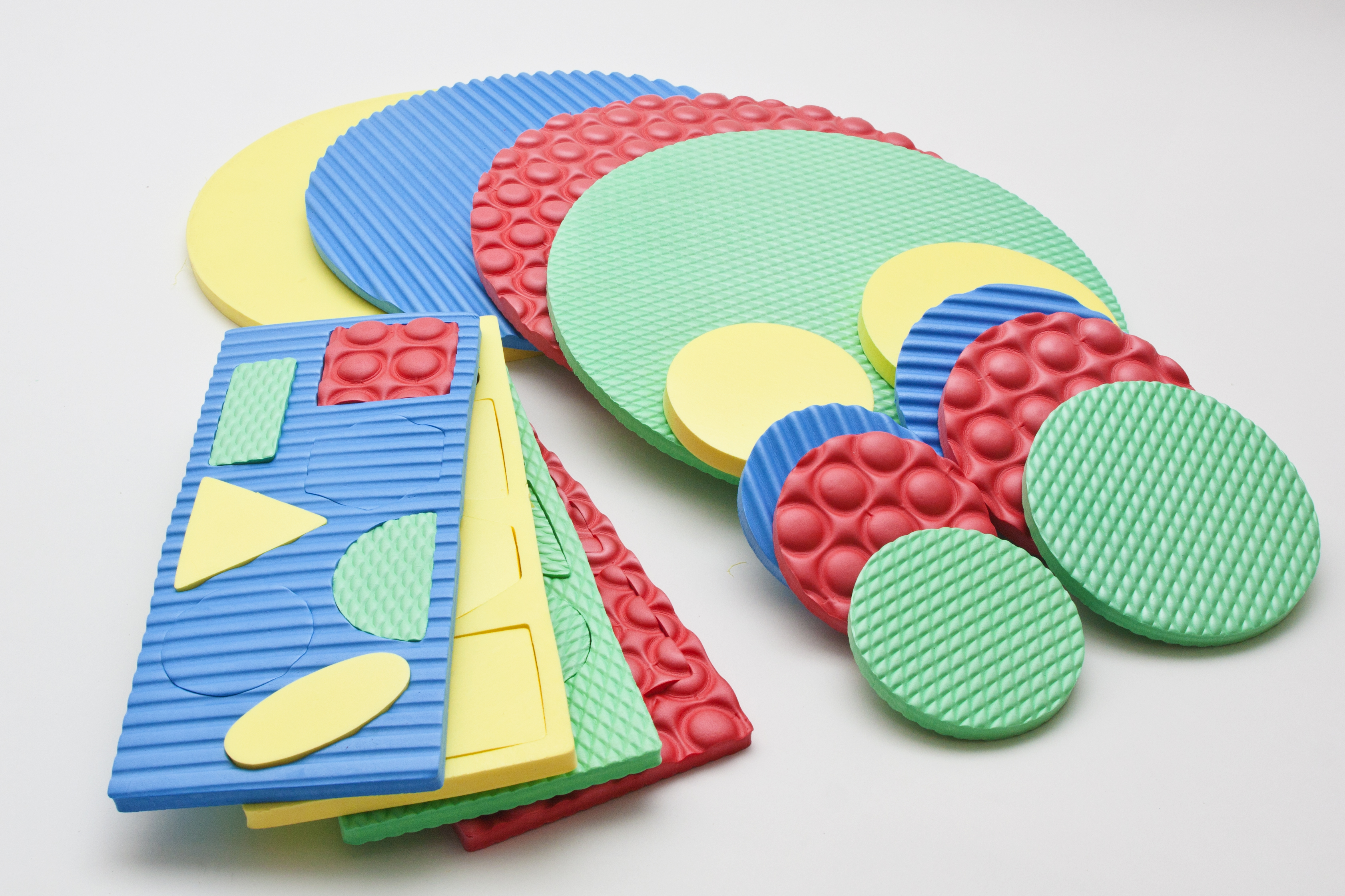 - Malé děti mohou stát na velkém kruhu bosýma nohama a přiřazovat tvary se stejným povrchem, na kterém právě stojí.