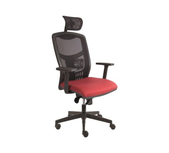 Moderní kancelářská židle s vysokým fixním síťovaným opěrákem vybaveným výškově stavitelnou bederní opěrkou a s bohatým čalouněním sedáku.