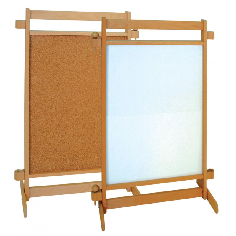 Dětský paravan vyrobený z kvalitního dřeva, vyplněný z jedné strany korkovou nástněnkou a z druhé strany popisovatelnou bílou magnetickou tabulí. Paravan lze jednoduše spojit s libovolným jiným paravanem pomocí páru spojek.