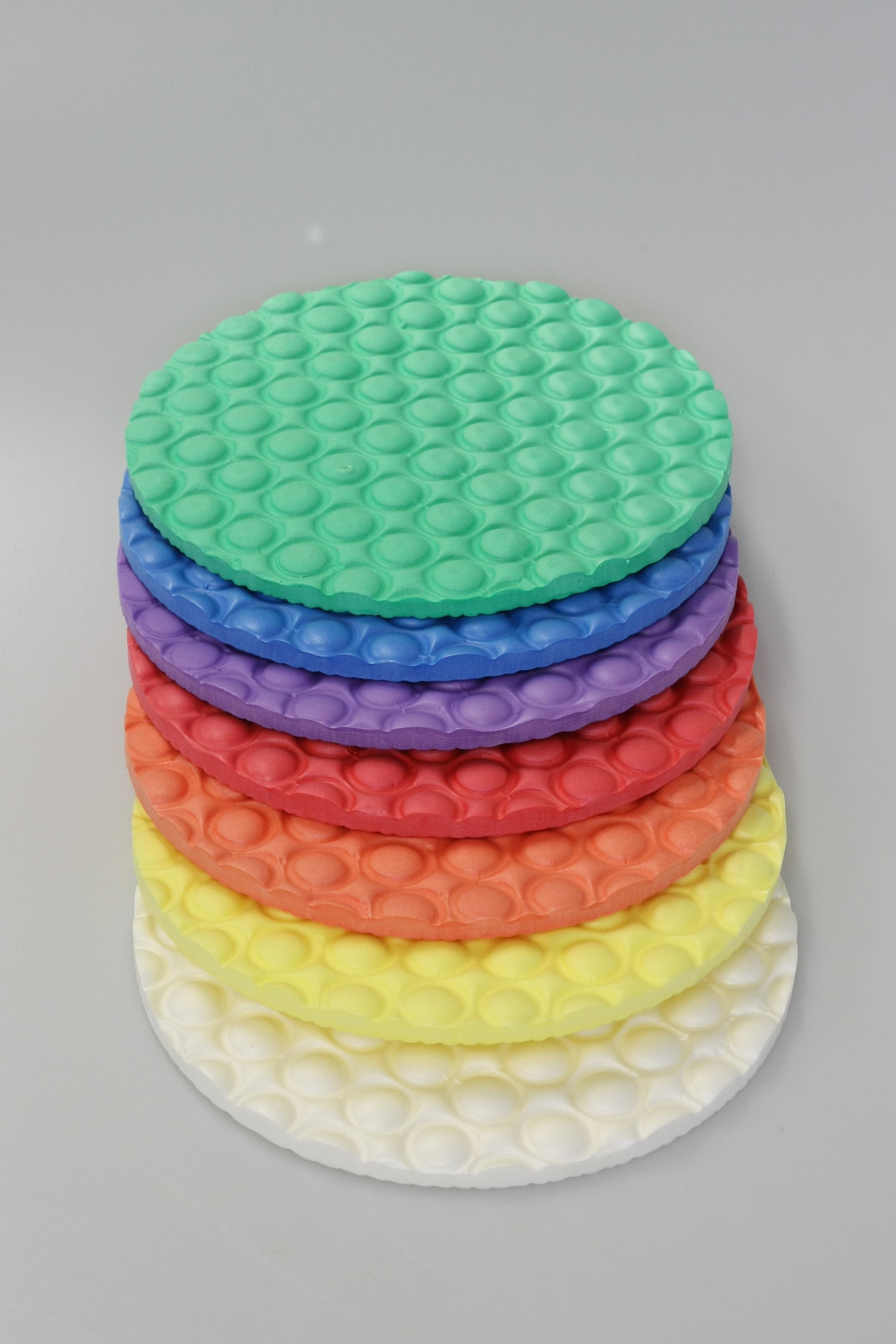 Víceúčelová termo-izolační podložka ve tvaru kruhu s masážním povrchem.