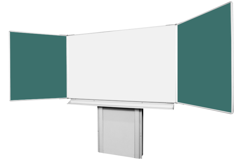 - Kombinace ploch pro popis fixem a křídou – zavřená tabule křídová (zelená), otevřená tabule křídla křídová (zelená) a střed na fixy (bílá).