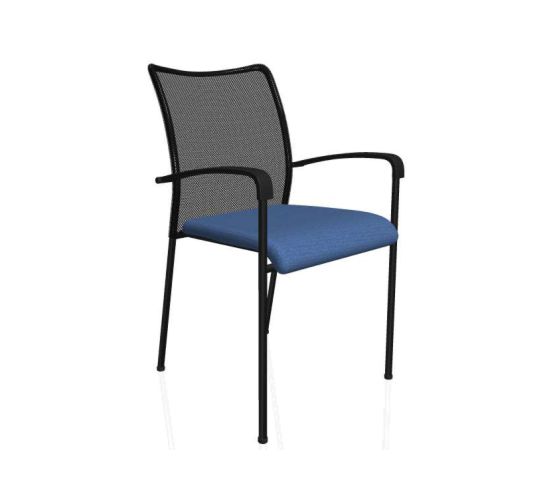 Moderní stohovatelná konferenční židle s opěrákem opatřeným černou prodyšnou síťovinou. Při očalounění sedáku zdravotnickou koženkou je vzhledem ke snadnému hygienickému udržování židle vhodná pro použití ve zdravotnických zařízeních.