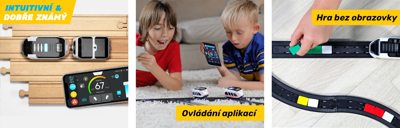 | Intuitivní hra s vláčkodráhou. Intelino má své vlastní smart kolejnice, stejně tak jej lze připojit ke klasické dřevěné vláčkodráze, kterou máte doma. | Ovládání přes mobilní aplikaci. Doprovodná aplikace je k dispozici v češtině pro chytré telefony s OS iOS (App Stroje) a Android (Google Play). | Kódování bez obrazovky. Vláček můžete ovládat a programovat i barvenými kódy, které sestavíte z barevných značek. |