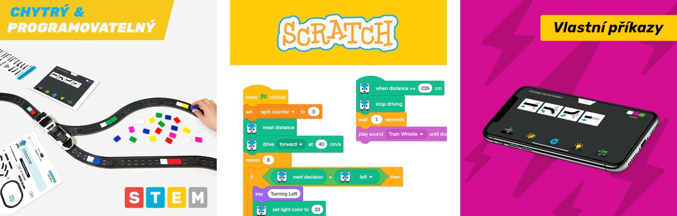 | Programování hrou. Každé dítě se bez obav může pustit do super zábavného kódování podle konceptu učení STEM. | Rozumí si se Scratch 3.0. Pokročilejší programátoři nebo školní týmy si najdou další zábavu ve volně přístupném rozšíření Scratche pro Intelino. | Editor kódů v aplikaci. Díky aplikaci získáte větší konotrlu nad vláčkem, naprogramujete si vlastní kódy a uložíte sestavy pro jednotlivé dráhy. |