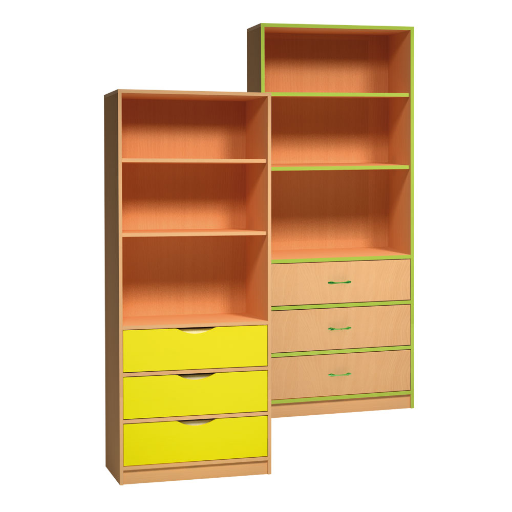 Skříň s otevřenými policemi a zásuvkami.  Nábytek je vyráběn z LTD tloušťky 18 mm, desky jsou na všech exponovaných místech zažehleny 2 mm ABS hranami. Dvířka jsou vybavena bezpečnostními panty s tlumeným dovíráním. Police uvnitř skříňky lze libovolně rozmístit díky nastavitelným poličníkům, které z... celý popis
